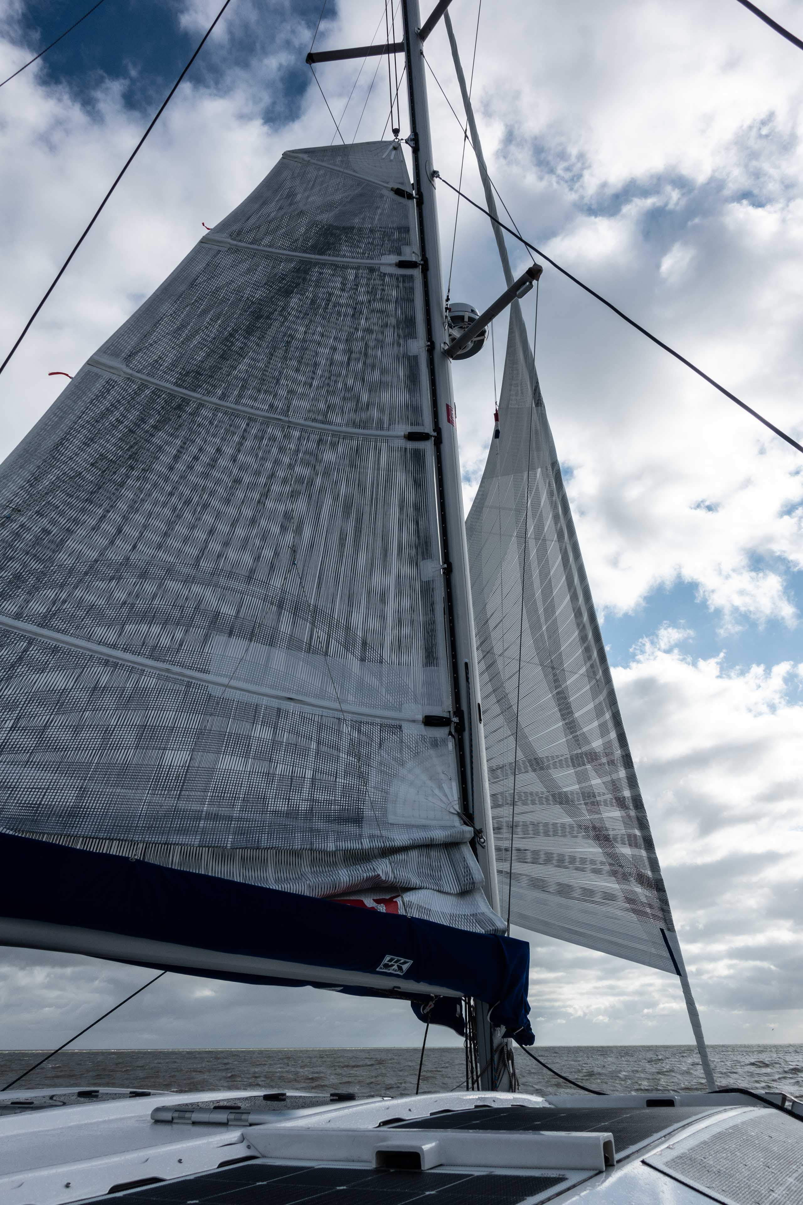 Unser elektrisches Antriebssystem von Ocean Volt überzeugt auf der ganzen Linie. Bei der Passage durch den Nordzeekanal und beim Navigationstraining im Wattenmeer waren wir zwei Tage nur mit Motor unterwegs. Trotzdem haben wir den Generator in 7 Tagen nur für insgesamt 10 Stunden gebraucht. Der Rest der Energie kam von der Sonne, vom Rekuperieren, oder am Abend aus der Steckdose. Das lautlose Motoren im Hafen und in der Schleuse fasziniert mal um mal.